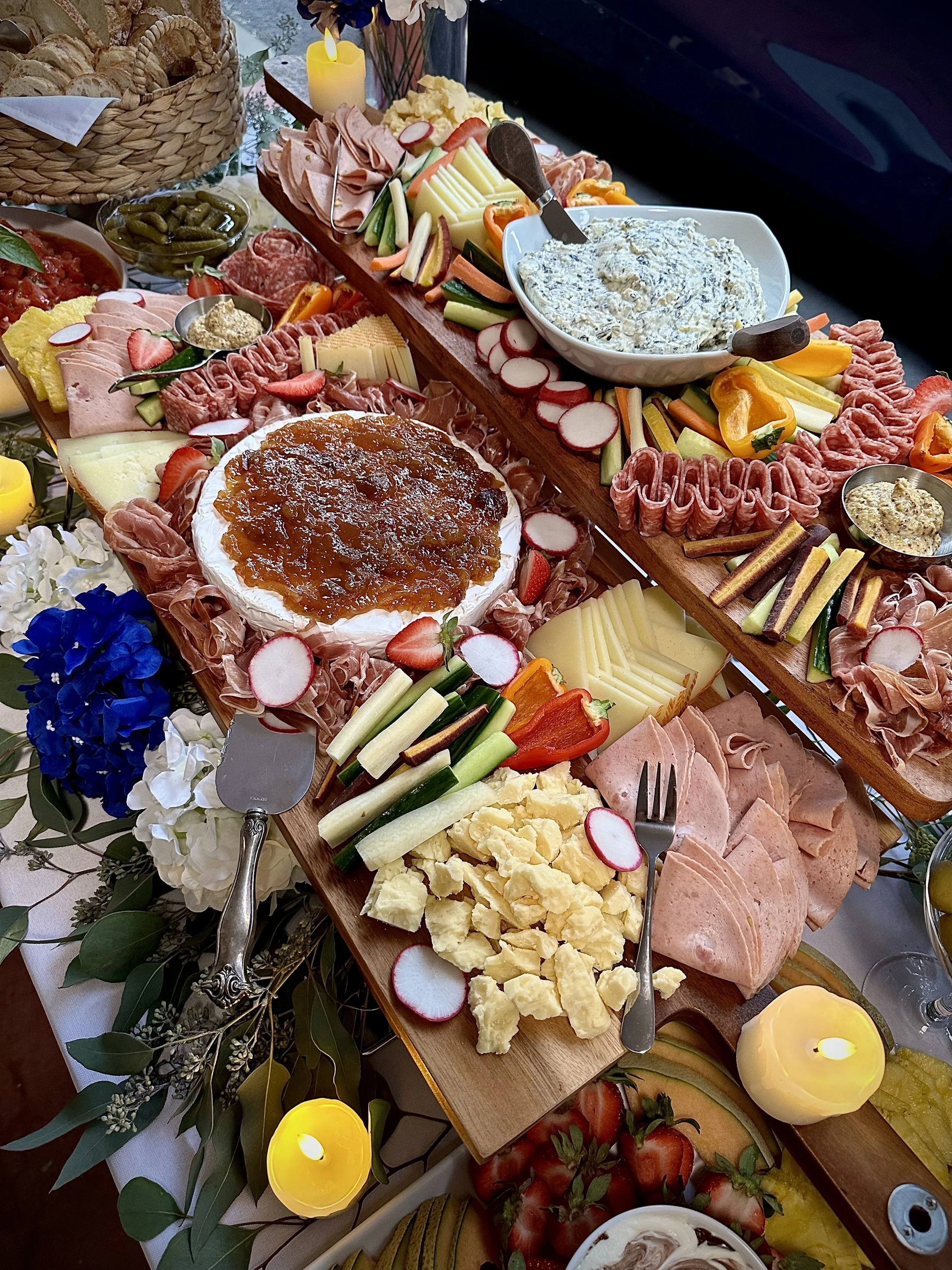We've curated a lavish table brimming with gourmet cheeses, salami, prosciutto, fresh fruits, crisp crudites, dips, jams, olives, cornichons, and a selection of nuts. This delectable spread is elegantly served alongside artisan crackers and freshly baked rustic bread.